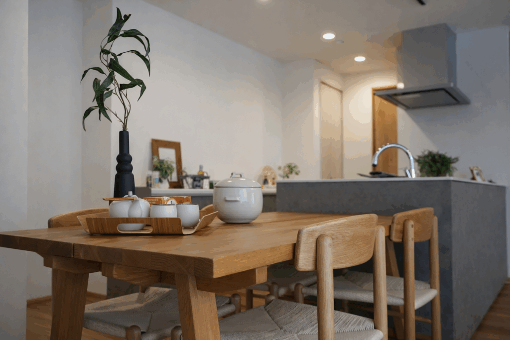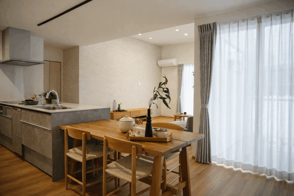 キッチンを中心にレイアウトすることで、料理をしながらでも家族との会話が自然と生まれる、つながりを感じられる住まいになっています。
